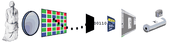 All stages of traditional chemical based photography can now be performed by electronic digital processing. Digital imaging includes recording the image, storing the image, manipulating the image and outputting the image. Move your mouse over the links below to highlight each element of the overall process.